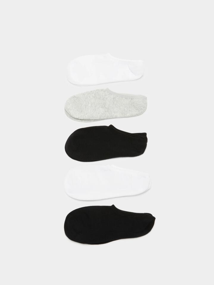 Pack of five pairs of socks. Low-cut design to sit below sneaker cuffs. Elasticised for moderate stretch. White, grey and black colourways. Materials: (82% Cotton / 12% Polyester / 6% Elastane). Sizing: This garment is one size fits all.