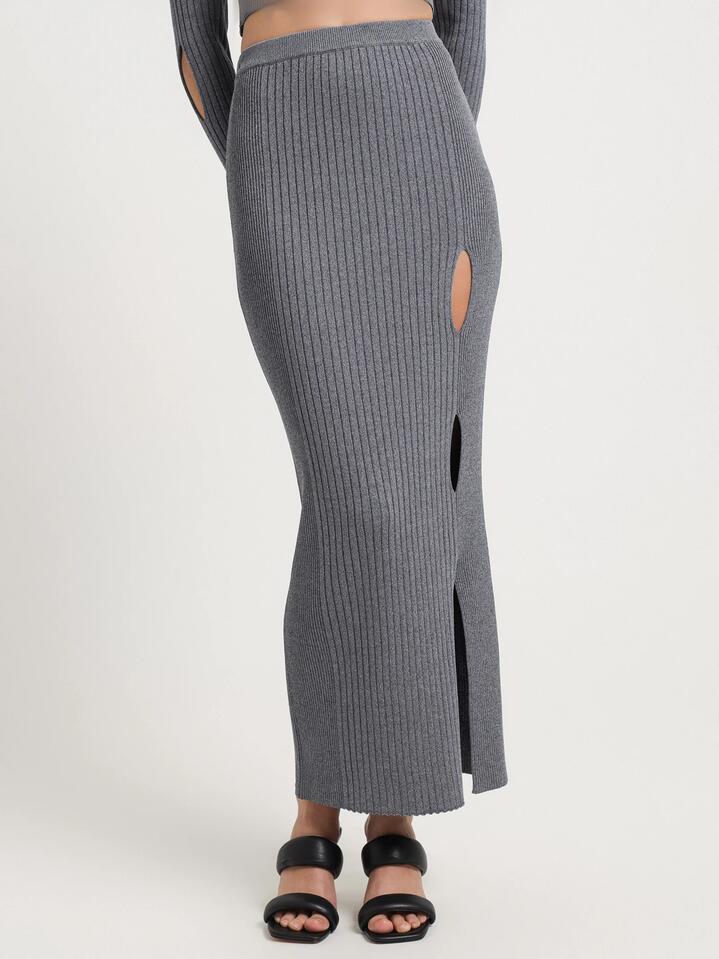 High-waisted midi skirt in grey. Ribbed fabrication offers generous stretch. Keyhole cutout down left leg. Bodycon fit. Materials: (Polyester / Elastane). Sizing: This garment is a slim fit and our model is wearing a size S.