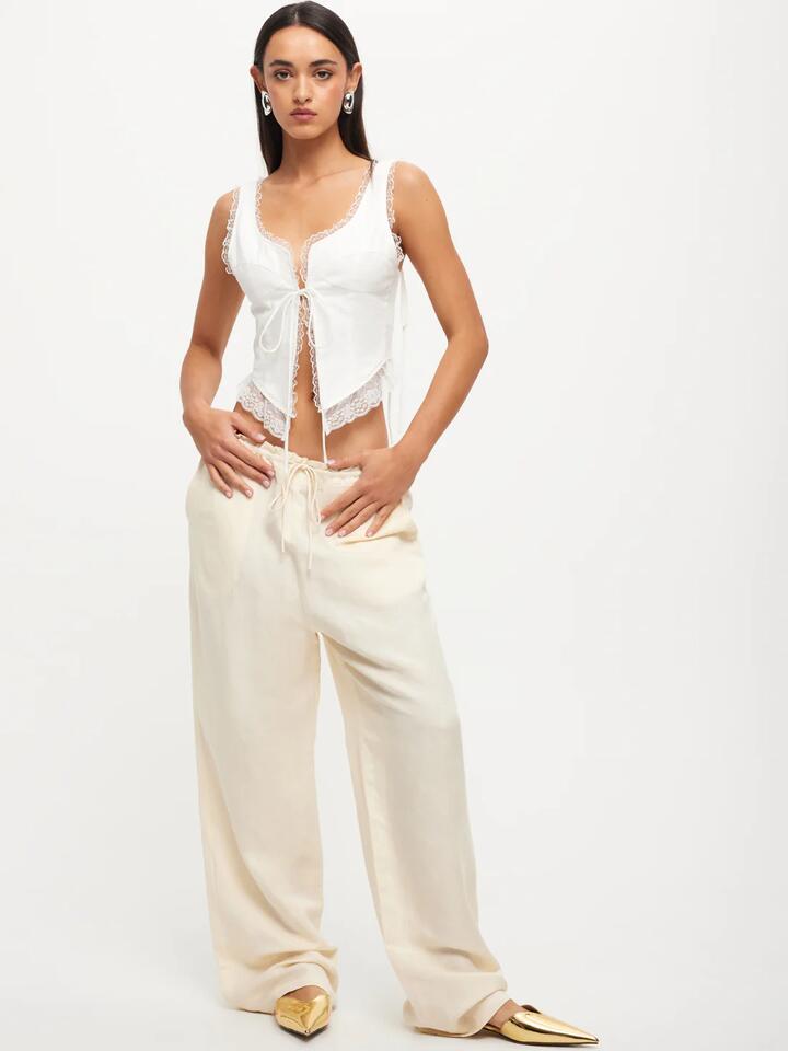 Low rise baggy fit Size down for a higher rise fit Drawstring waist Side pockets Material: Linen-blend (55% Linen / 45% Viscose) Sizing: This garment is a low-rise, baggy fit and our model wears size S.
